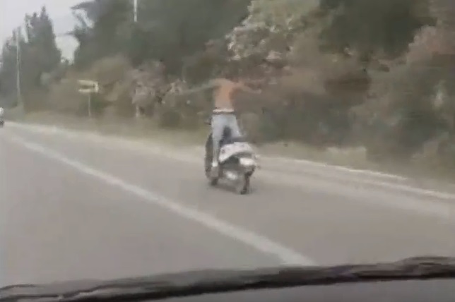 Ο ημίγυμνος μηχανόβιος οδηγώντας, σηκώθηκε όρθιος στα δύο του πόδια και με ανοικτά τα χέρια, μάλλον θέλοντας να αναπαραστήσει τη σκηνή του “Τιτανικού” στην πλώρη του καραβιού.